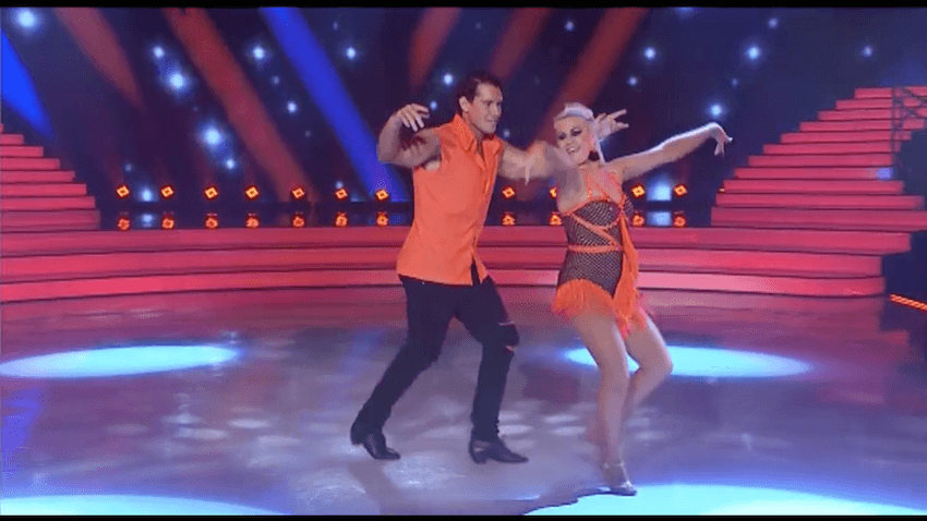 Hayes fares a bit better this week and seems to be genuinely enjoying herself, but once the backflip is done and dusted you can feel her rushing ahead to get the dance over with; she looks genuinely relieved to have gotten through it without messing up. She’ll probably hang around for a while, because she’s very likeable on camera, which is why she’s on the primetime news. This is not Rockin’ Rog rocket science.
