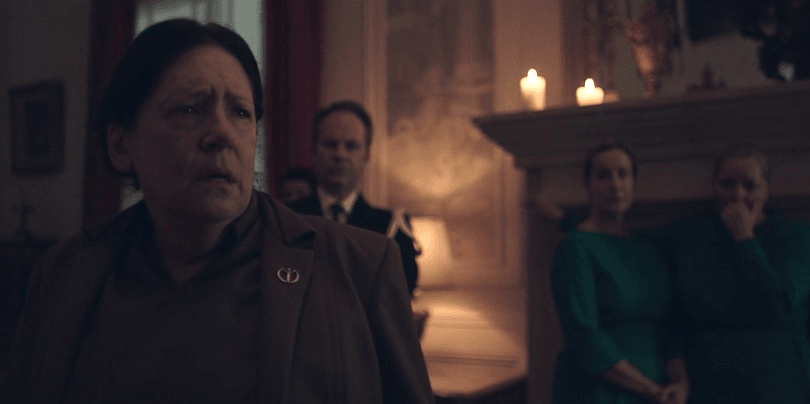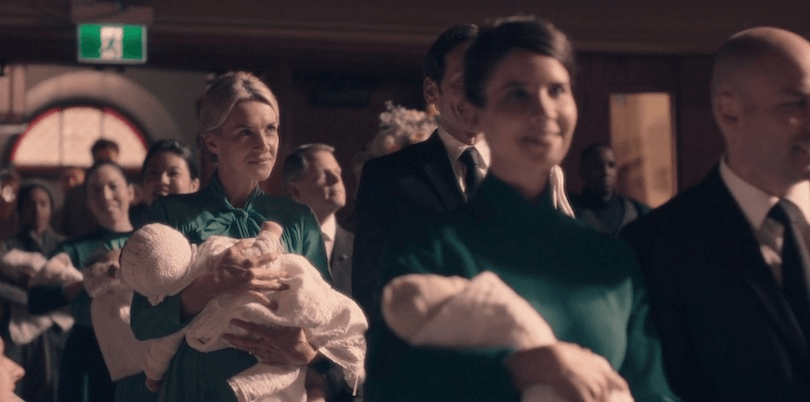 Say what you will about Gilead, but they bloody love a straight line. This week’s episode was a masterpiece of order and symmetry, as the good folk of our favourite dystopia came together to celebrate all the new babies. Nobody does ceremony better than Gilead, and every single shot of this week’s episode was choreographed to perfection, filled with muted colours and shadows and balance.