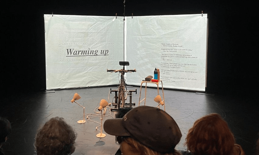 And the cycling is very literal – the staging is just a stationary push bike powering a couple of lamps above and below, in front of a presentation of the performance, like a spin cycle class set in a lecture hall. And while Joe has performed ASHOANZT himself, he has also invited other Asian playwrights and actors to lead it as well, and on Thursday night I caught Dawn Cheong take on the challenge of cycling for 60 minutes while performing a script she was only reading for the first time.