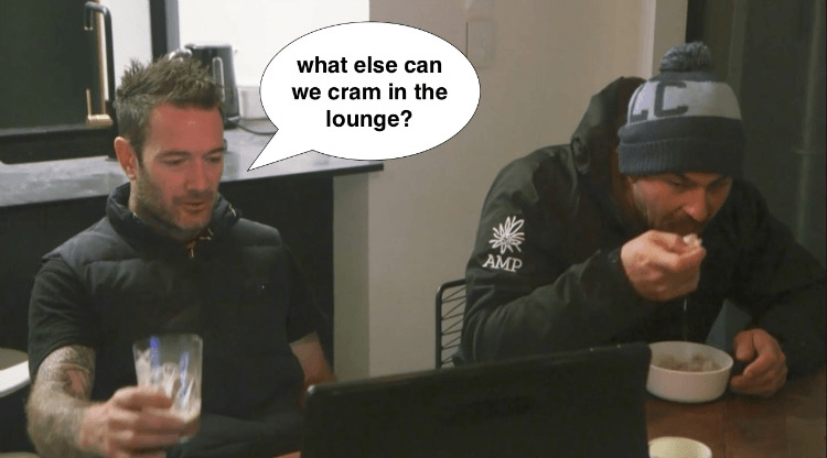 As the old saying goes, “more is more” and, because there wasn’t enough going on in their living room already, the HamDads threw in some bookshelves, a cowhide rug, some LED strip lighting and fiddled around with furniture placement and their Louvre wall to wow the judges. It totally worked. Jason and Bernie were impressed, expressing their admiration for the radiator heaters that weren’t new but seem to be a never-ending source of amazement to all on The Block.