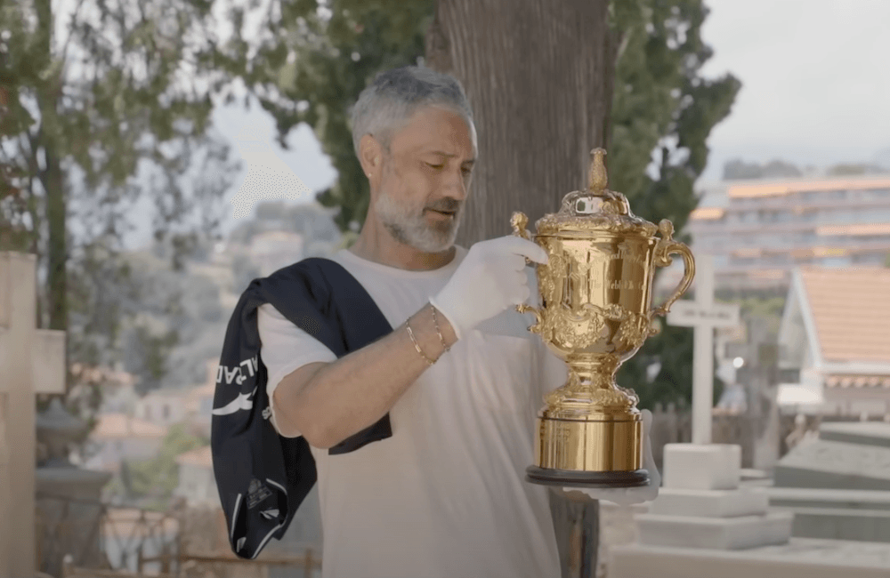Despite the William Webb Ellis trophy being in the custody of South Africa at the time of filming, NZ Rugby called in a few favours so Taika can use it as a prop. It’s “definitely heavier than an Oscar,” reports one of the few people in the world to have held both, “and in some ways – don’t tell the Academy – maybe it’s a bit more meaningful to me.”