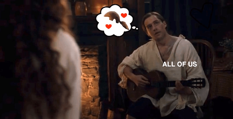 But do not pass by Jamie’s new wig, to which we must pledge our loyalty by the light of a giant bonfire. If I were a chef, I would raise my fingers to my lips and make a “mwah” sound about this hairpiece. If I were a time-travelling historian who once dug my way out of a hut with a spoon, I would strum a tiny guitar and serenade it. Maybe Claire gives doe eyes to Jamie because she loves him like a hot potato, maybe she just rates his new ponytail. Jamie Fraser’s hair is finally perfect, which is a gift worthy of a sex montage of old people doing it in a shed and some unexpected close-ups of Roger’s naked bum.
