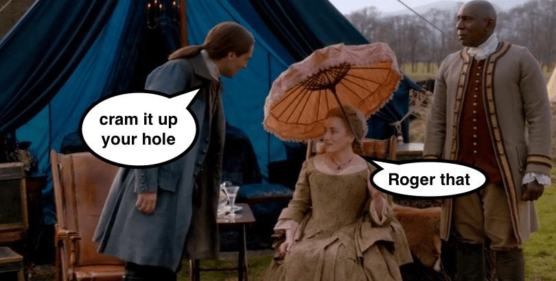 Roger was also having a sheet time, after Jocasta announced she was leaving her entire estate to wee Jemmy. It was a test for Roger, because cunning Jocasta wants to know if she can trust a knickerbocker-loving Protestant who might be raising another man’s son. I missed the finer points of her argument, but I do know that Roger telling Jocasta to “cram it up your hole” was the best part. Cram it up your hole! It was the wedding night sexy-time montage, all over again.
