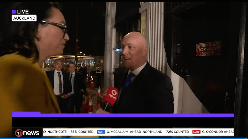 After Chris Hipkins conceded, Luxon arrived at Auckland’s Shed 10 and talked briefly to journalists as he walked in. “I’m feeling great,” he told TVNZ’s Maiki Sherman. “It’s been a great day and a great result, I thought it was going to be great, we had great support across the country, it’s just great to see.” Wait until he finds out about Linda the Laser Kiwi! That really WAS great.