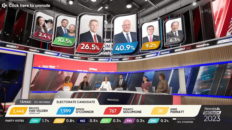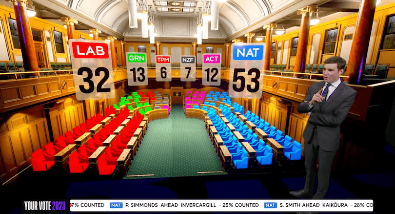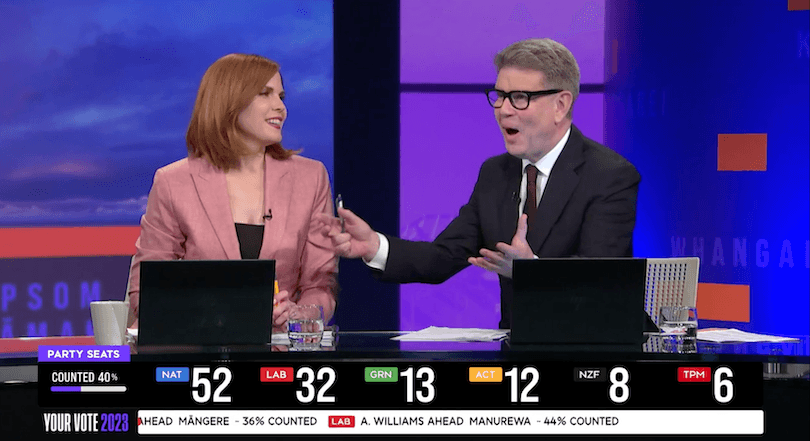 Patrick Gower was flying high on electoral excitement all night, and the Newshub team were having a ball. Paddy was in The Matrix, he was in Paddy’s Parliament, he was in his element. He cheered on his favourite MP Maureen Pugh (“Let’s go, Maureen!”) and told his colleagues that when they said “battleground” (had anyone even said battleground?), they had to really mean it. “BATTLEGROUND!” he shouted. “BLUE-NAMI!” he cried. “THIS IS MY HOUSE ON ELECTION NIGHT!” All in all, the LOLs hit faster than those beams from Linda’s eyes.