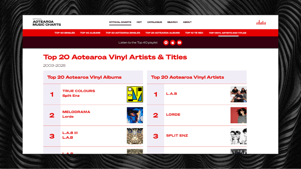 Check out the new vinyl charts in all their glory over on the Official Aotearoa Music Charts website – Top 40 Vinyl Charts and Top 20 Aotearoa Vinyl Charts. Launched in tandem with The Long Play podcast, proudly brought to you by Recorded Music NZ, Coffee Supreme and Holiday Records.