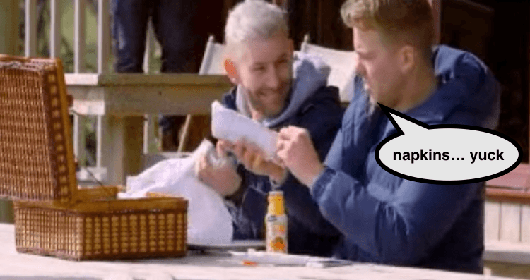Ever the optimist, Aaron thinks a little picnic and a spot of glamping will fix everything, but Ben’s already started the next chapter of his life as a brick wall of a human. Aaron opens up about his relationship misdemeanours in the past, Ben calls them a red flag. Aaron tries to plan out a cute camping date, Ben grizzles that he hates camping. Aaron tries to make mimosas, Ben says “yuck”.