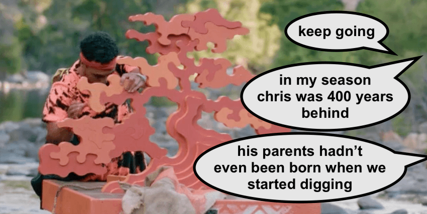 Fossicking about and finding clues and wedding dresses, James uttered an involuntary “OOSH” before tucking into a tin of tuna. But the dream vacation was not to last. A note about the hidden fortune upstream eventually sent James on the treasure hunt with Cully and JP, but some crucial oversights provided insurmountable hurdles. He left his photograph clue behind which gave him a huge delay, and even Lance’s wisdom from the cheap seats couldn’t save him.