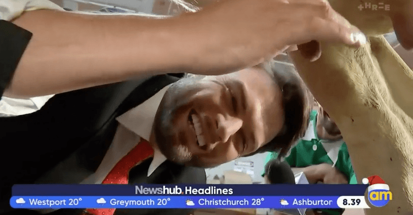 Between the gingerbread and the gifts, the news came thick and fast. “We’ll speak to a popular vegetable grower we met earlier in the year,” Ryan promised on AM, while Breakfast looked back on the sporting year that was. “Posi vibes all round,” Indira Stewart told us, while the AM Show held a political debate with Labour’s Kieran McAnulty and National MP Erica Stanford. The vibe was light and cheery, and after the political jaunty jibes had finished, everyone exchanged presents. Erica gave Ryan a clip-on man bun. “This isn’t your hair, it is?” Ryan asked Erica. “Because that would be weird.”