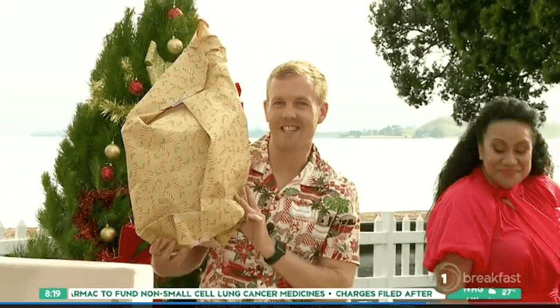 What definitely wasn’t weird was Ryan chucking on an elf’s slipper to lead us into the 7.30am news. “Things are crazy here!” he told us, waving his crazy foot around the crazy studio during this crazy time of year. The mist was lifting on Breakfast, and AM gave a traffic update from the tiny town of Lauder. There was no traffic, and it was two hours to Dunedin, like always. Crazy! Santa popped into AM with a sack of goodies, and admitted to Ryan that the elves were demanding higher wages. Ryan reckoned they were unionising “up the wazoo”. Over on TVNZ 1, Breakfast showed how to wrap the wazoo out of lamps and watering cans.