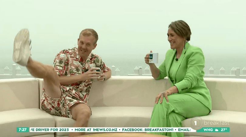 Breakfast was also away laughing, but the weather hadn’t got the memo. Their live broadcast from Mission Bay was shrouded in a thick coat of grey mist that made summer look… a little bit shit. “It’s just starting to drizzle, but that’s indicative of the year we’ve had,” Jenny-May Clarkson said, while a festively dressed Matty McLean apologised for the amount of thigh he was showing the nation. “You’re quite hairy, aren’t you?” Jenny-May remarked. It’s nice to think that after all these years of early morning television, we’re still learning new things about each other.