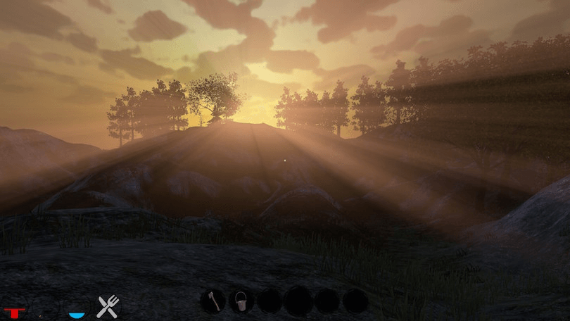 The player takes over from there, trying to keep this dickhead alive on an uncharted island that looks eerily like a forest in the middle of Oregon. It’s rolling hills and pine forests as far as the eye can see, and there’s next to no water – just one little marsh right next to where you start. This all looks pretty beautiful in the dawn light, in an ostentatious Malick-and-a-half kind of way.