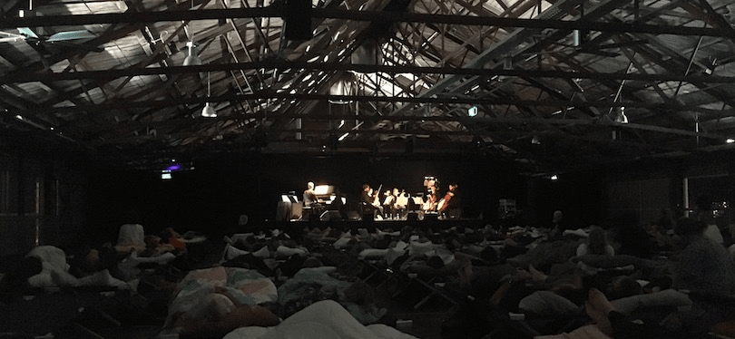 By one o’clock, most people are fast asleep or at least closing their eyes. I’m fighting to stay awake. A staunch plan to get an early night last night predictably resulted in me getting four hours’ sleep. So I had a nap after work, woke up two hours later in a panic that I’d slept through and missed the show, inhaled a lift plus and a coffee, and arrived at Shed 10 ready to stay awake all night. The event description had encouraged sleeping throughout the eight hours but to sleep would mean missing the performance. I didn’t pay $190 to miss out on the music.