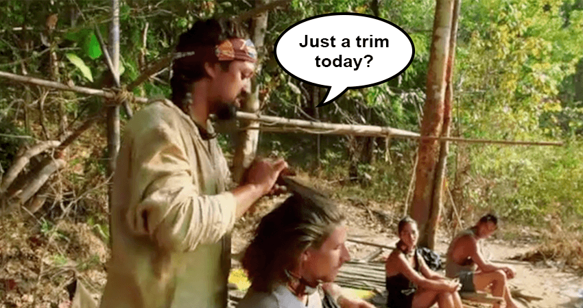 With a bit of technique coaching from Renee, Adam managed to perfect the “Man Plait” (also known as just a “Plait”) on Brad. Brad’s hair was absolutely snatched, and I wonder if this was an intentional strategy of Adam’s to pull Brad’s hair so tight that he couldn’t concentrate in the next challenge.