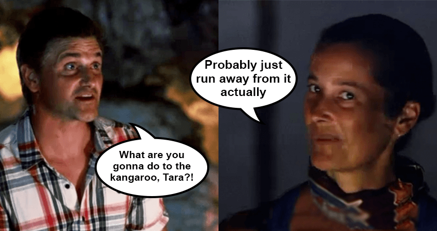 We hear a little bit from Tara during tribal, who at this point seems to be following Lisa’s lead, and not doing too much strategising of her own. Chissy asks if Tara plans on keeping the same pace through the game, and Tara responds bizarrely by threatening to fight a kangaroo.