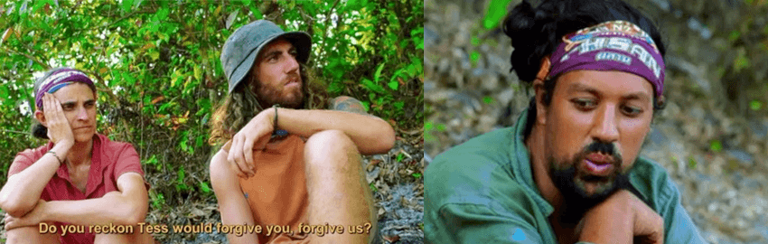 Arriving back at camp from the reward, Brad begins his performative apology to the other players who weren’t picked to join him on the reward, while Dave stands in the corner groaning because he ate too much. Adam isn’t having a bloody bar of it, and we’re treated to a few more of his legendary impressions.