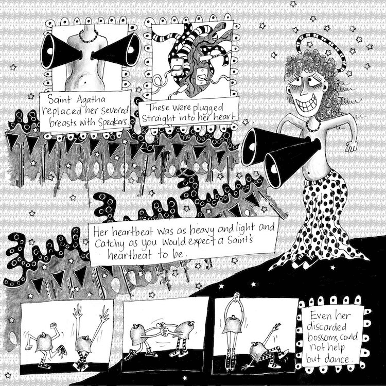 Sonic Comic‘s dual-media nature makes it seem even more sprawling and multifaceted than most excursions of this kind. Bek Coogan’s appropriation of Palmerston North real estate advertisements is mirrored by field recordings from the site in Savage, while Dean Ballinger’s ‘Bande Dessinee In C’ depicts musical notes and facial expressions, which you can “follow the bouncing ball” over the track’s 21 seconds; Strange Stains’ ‘Hysterical Attitudes’ matches a rumbling hymnal with a comic about WWI-era New Zealand safe-sex pioneer Ettie Rout, “the wickedest woman in the world”; Toby Morris’ gentle ‘Quiche’ needs the song to unlock his comic’s deadpan duelling pronunciations.