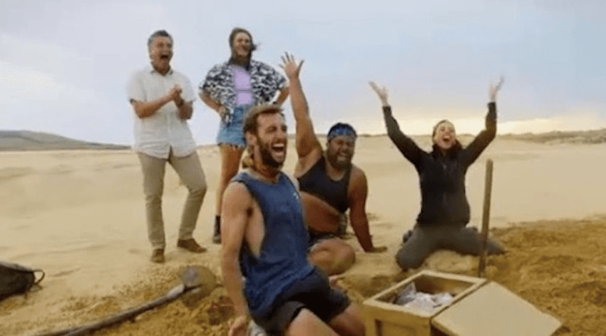 What happened next was one for the history books – Chris assessed the areas of dense grass around the site, remembered how hard it was to remove when he was gardening at his old flat, and immediately started digging elsewhere. His shovel hit the treasure chest with a satisfying “doof”, and he collapsed into tears as his fellow competitors helped him excavate the $100,000 cash prize for Rainbow Youth. “That’s so good,” he wept. “That’s so good.”