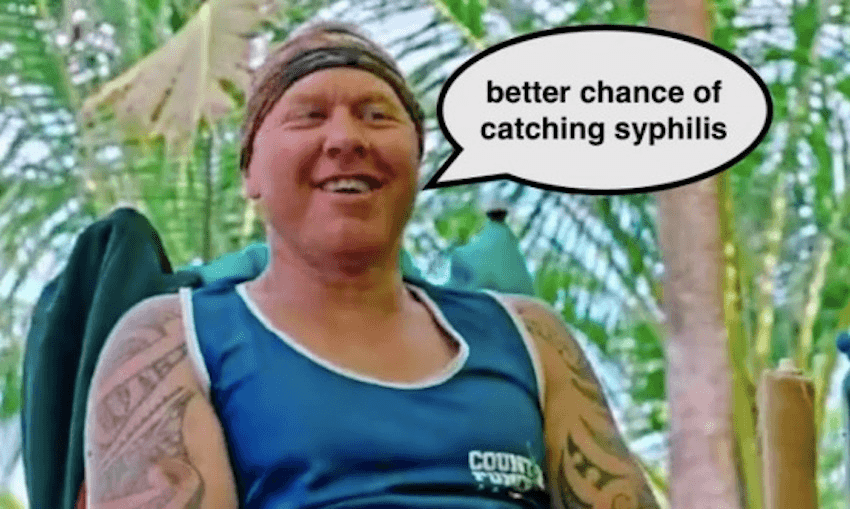 One half of the epic “rugby vs league” elimination battle, where he was sent home by a spritely 63-year-old Sir Buck Shelford. Also put his muscly buddy Art Green up for elimination in a shock twist. “He was a villain but but I don’t think he would have understood that or would maybe even accept it now,” said Duncan. “He was very intense to the point of happily sort of sabotaging his own team to their faces based on his weird code of Celebrity Treasure Island.”