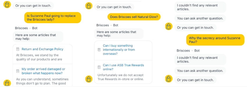 But never in all those years did these two women ever appear in the same room. This is a paradigm shift. A cultural reset. An advertising swing even more shocking than when Lily from Big Save stopped shouting and sat down on a bean bag. I immediately got to work figuring out what the hell was happening. Which is to say, I Googled Suzanne Paul + Briscoes and found a small yet distressed community on Reddit, before searching Suzanne Paul on the Briscoes site and finding two “Paul Wood” clocks on sale for $35.00. The chat bot wasn’t much help either.