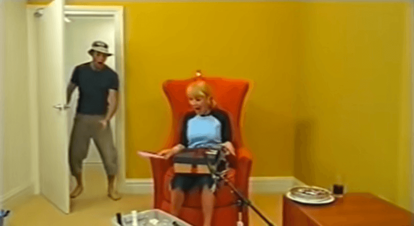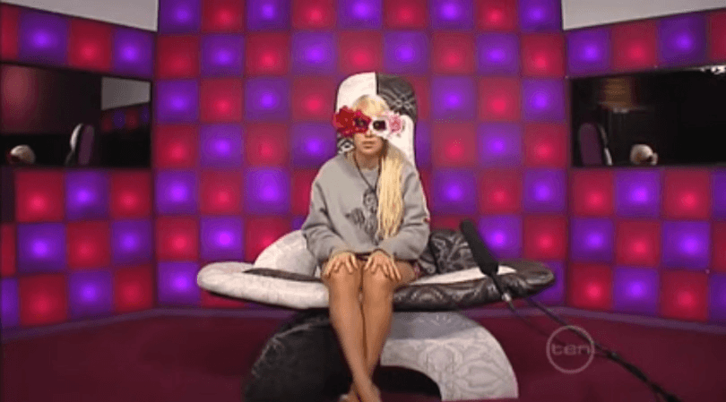 My memories of 2003 are as fuzzy as this screenshot, but that’s probably my fault for having too many Purple Goannas on an empty stomach c.1999-2004. BBAU’s third season featured two houses, and the Square House diary room was a geometric nightmare that hurt your eyeballs before you’d even looked at it. That chair was built to last, sadly, and let’s not even mention the state of that coffee table. Marie Kondo to the diary room, ASAP.