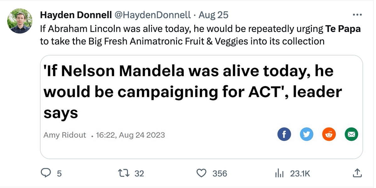 Every journalist has their white whale. The story of the century that they just can’t quite stand up. For some, catching that white whale would mean a politician being held to account. For others it would mean an overdue change of law. For Hayden Donnell, it meant seeing the Big Fresh animatronic fruit and veges in New Zealand’s national museum, Te Papa.