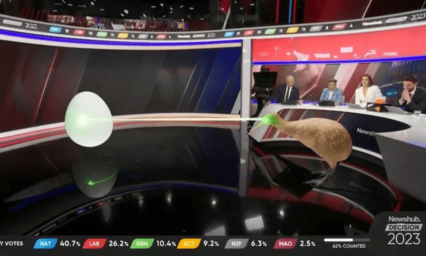 Election night was full of surprises, but the biggest one was Linda, Newshub’s augmented reality bird who spent the evening plopping out politicians. Not only did Linda the Laser Kiwi give birth to new members of parliament, but her laser eyes also blew losing members to smithereens. AM’s pooing wētā had nothing on Linda. Who said politics couldn’t be fun? / TW