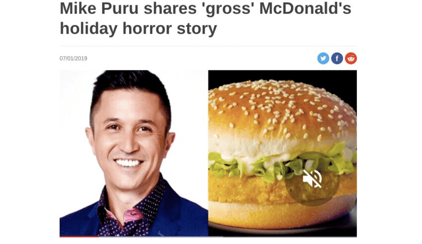 ‘Mike Puru shares ‘gross’ McDonald’s holiday horror story’ was published on Newshub on January 7, 2019. The article details the genesis of the food poisoning, describing a “disastrous McChicken experience” that led to the broadcaster losing four kilograms. It recounts how, after complaining about the long wait times at McDonald’s on New Year’s Day, a friend of Puru’s gifted him an unwanted burger which he immediately put in his backpack and forgot about on “a very hot day.” He later reheated it, and paid the price for the decision from “both ends”.