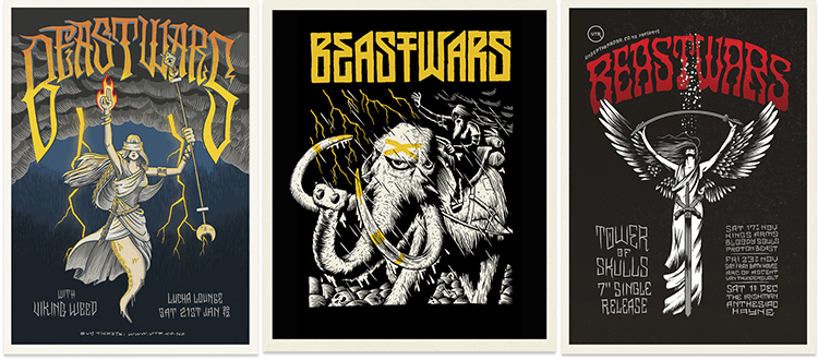 I’m wildly biased, but Beastwars are right up there on my list of all-time favourite bands. Watching them is like witnessing a slow motion avalanche, or a mountain crack in two. If monumental riffs are your thing they’re the masters, and I’d make a case for Matt Hyde being one of New Zealand’s most singular, charismatic and engaging performers. I’ve been drawing posters and t-shirts for them since the early days and over the years of watching and listening I’ve fallen deeper and deeper in love.