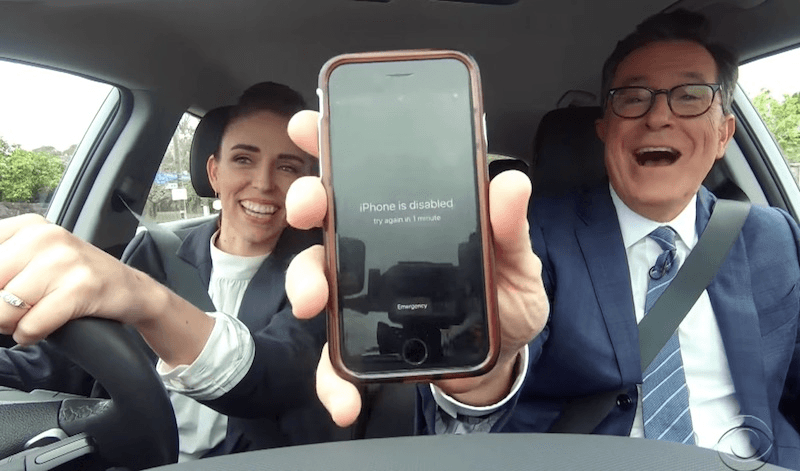 In an attempt to unlock Ardern’s iPhone using facial recognition technology, Colbert thrusts the rectangular device in front of her face multiple times while she drives in a high speed area. The NZTA advises that “anything that diverts a driver’s attention for more than two seconds can significantly increase the likelihood of a crash or near-crash.” It is also illegal to send and receive text messages while driving in New Zealand. Had one popped up on the phone while it was in front of her eyes, she could be facing an $80 fine and 20 demerit points. Colbert? Jail.