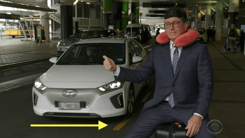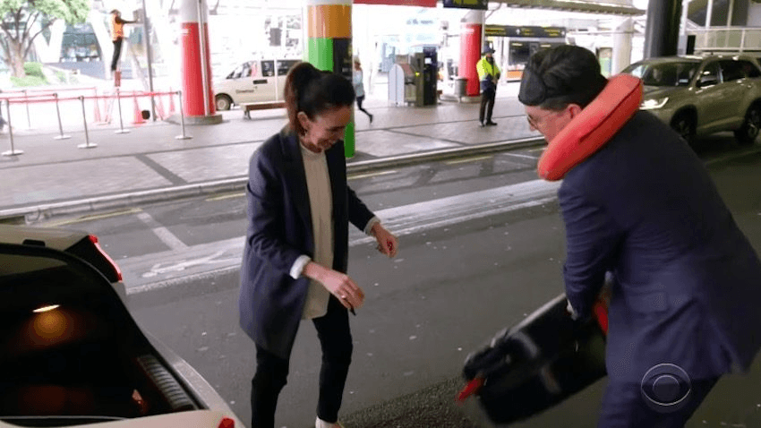 When Ardern picks up Colbert from the airport, the car is very clearly parked on broken yellow lines. “You must not park or stop your vehicle on ‘no stopping’ lines (broken yellow lines) marked within 1 metre of the edge of the road” the NZTA website reads. Not only does the infringement warrant a $60 ticket under Rule 4 Schedule 1 Land Transport (Offences and Penalties) Regulations 1999, it also makes any insurance on the vehicle void in the case of damage – a huge risk considering Colbert’s criminally irresponsible approach to suitcase-loading. Go to jail.