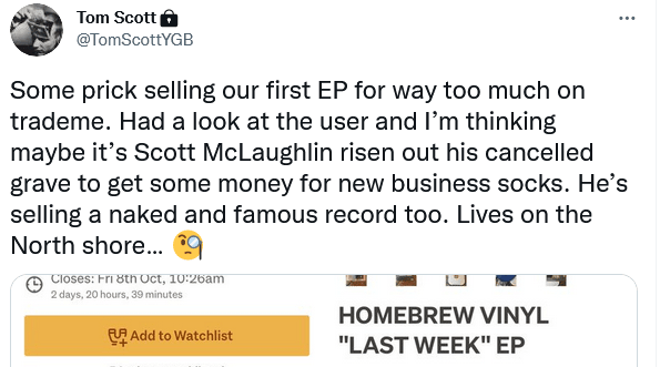 The auction caught the attention of someone else. On Twitter, Home Brew’s outspoken front man Tom Scott suggested the seller — a Trade Me user who went by the name ‘scottmac3’ — might be former Warner Music New Zealand boss Scott Maclachlan, Lorde’s ex manager, who left his job after years of “harassing behaviour” was exposed by Alison Mau in the Sunday Star-Times.