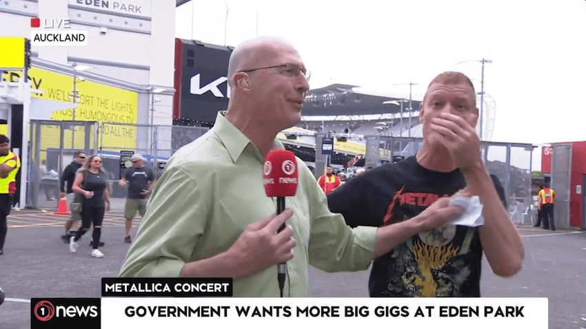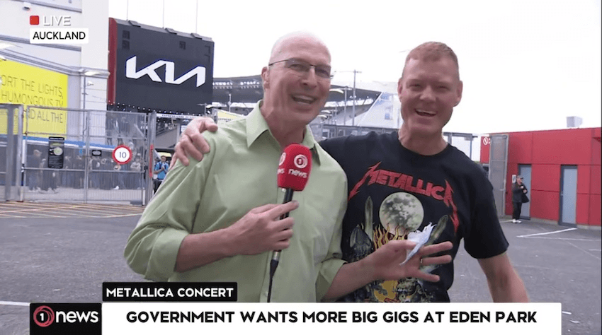 Cup holders may well be holding the New Zealand economy together right now, but the real metal magic hadn’t even started yet. Next, Dallow crossed live to Eden Park, where the resident rocker was now standing – still green-shirted, still frothing with excitement. The headline act weren’t due on stage for a few hours, but unassuming 1News viewers were about to watch an extraordinary show of their own.