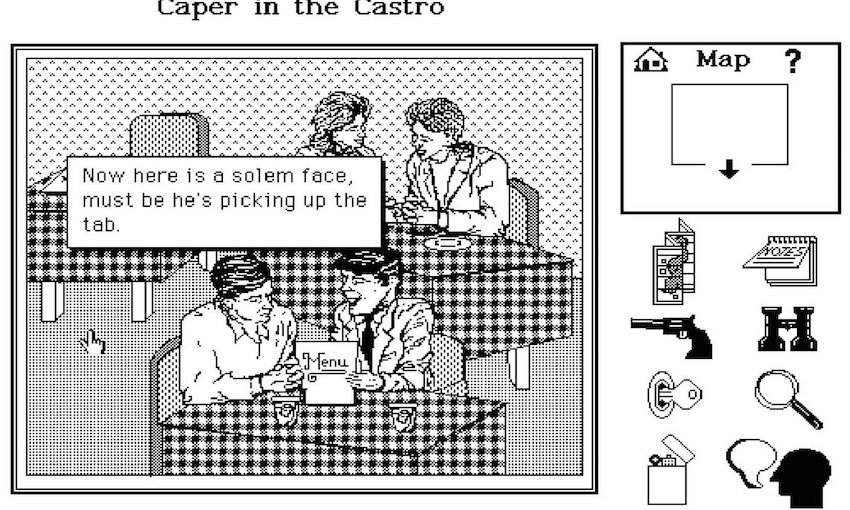 Another game mentioned is the murder/mystery charityware game Caper in the Castro (1989) designed by C.M. Ralph, which is playable on an emulated ’80s Macintosh. I watch a man stop reading the text on the wall and rush straight to this game. He fumbles through it as his boyfriend dutifully helps him figure things out. “I felt like I was going in a time machine,” he later tells me.