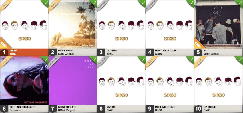 Their current release is a six-song EP, imaginatively titled Six60 EP. As well as going platinum, it has had a quite absurd dominance of the Top 20 NZ Singles chart, neatly illustrated by this week’s version:
