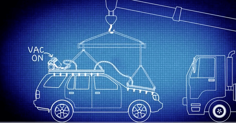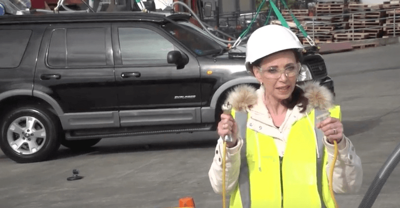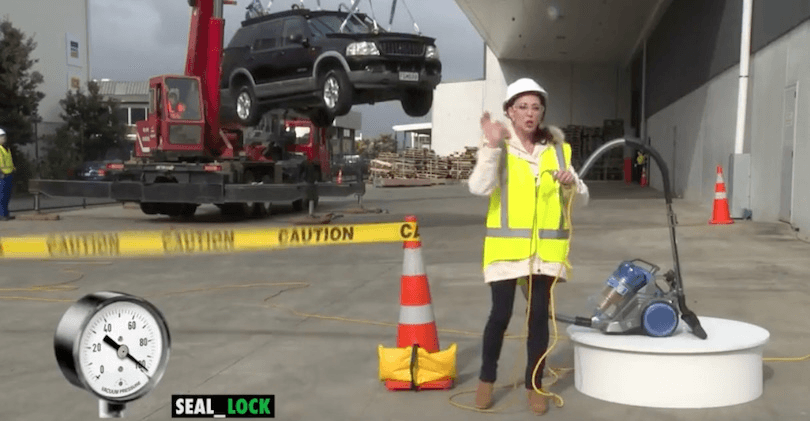 Suzanne’s team begin by attaching the Floor Wiz to two enormous suction cups, much like how I used to express breast milk. The cups attach to the SUV, the vacuum cleaner turns on, and by the power invested in Suzanne Paul, the truck will magically lift off the ground.