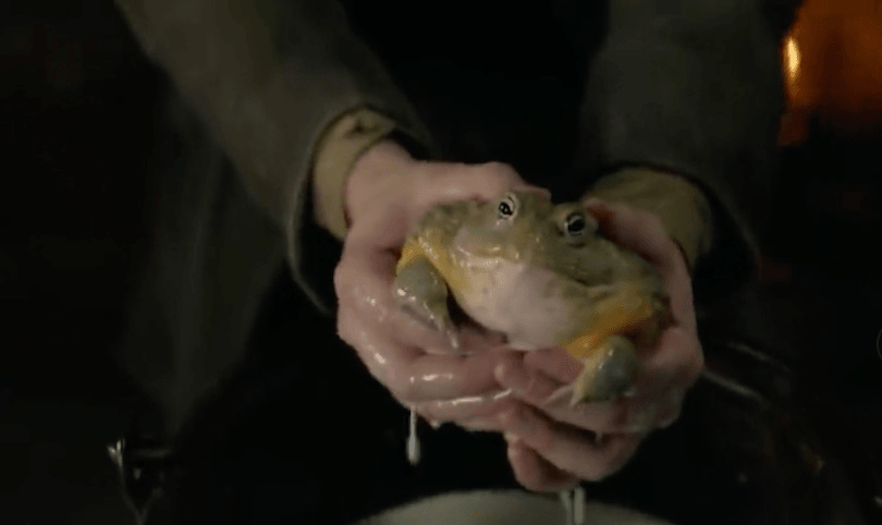 But now, Tom was never going to read a dirty word again. Let’s hope Jamie doesn’t show him the newspaper that arrived with the Colonel, bringing news of the Boston Tea Party and reminding Claire that war is on its way. While Jamie saved Fergus from harming himself and took him home to Marsali, Claire grew worried. She could sense the ominous tides of history lapping at her feet, and she didn’t like it. Or, maybe she just wanted a cup of tea. Oh, to be a bullfrog in that kitchen.