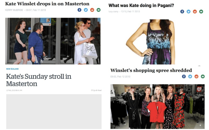 Twitter was slightly less charitable. “Kate Winslet in Masterton, having been shopping at Pagani – next you’ll be telling me she’s eating KFC in Huntly #standardsareslipping,” tweeted one punter. “Kate Winslet just got clothes from Pagani?!? Now we don’t just share a name, but taste in scratchy, ill-fitting leisurewear,” tweeted her namesake. Others provided alternatives: “I’d have thought Kate Winslet to be more of a Max person. Isn’t Pagani all overpriced nylon formal dresses and sequinned boob tubes?”