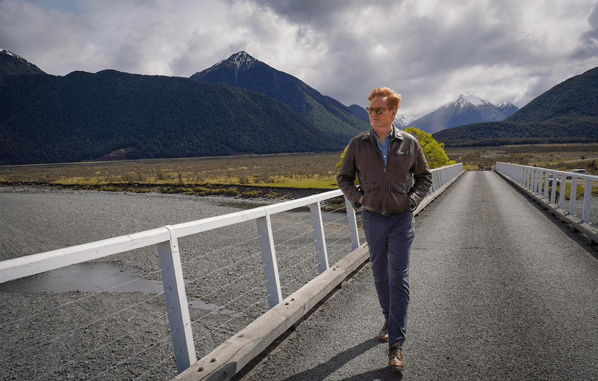 It’s not your typical New Zealand tourist experience, but it’s one of the more delightful moments from Conan O’Brien Must Go, the travel series that sees O’Brien roam the world to meet his fans. In the latest episode, O’Brien is lured to our shores by Riley, a fan from Hokitika who reveals on O’Brien’s podcast that he lives in a container house and poops into a bucket. “It’s a journey that would bring me to the brink of madness,” O’Brien tells us, as we watch him dramatically hack his way through New Zealand’s thick native bush.