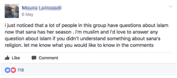 When one Muslim fan posted in the group that she was open to answering any questions about Islam brought up by the show, fans asked her thoughtful questions about dating and sex, why Sana’s mum removed her hijab at home but Sana didn’t and whether they thought Sana was a fair representation of girls like her. There wasn’t a single lame or offensive question about terrorism in that thread.