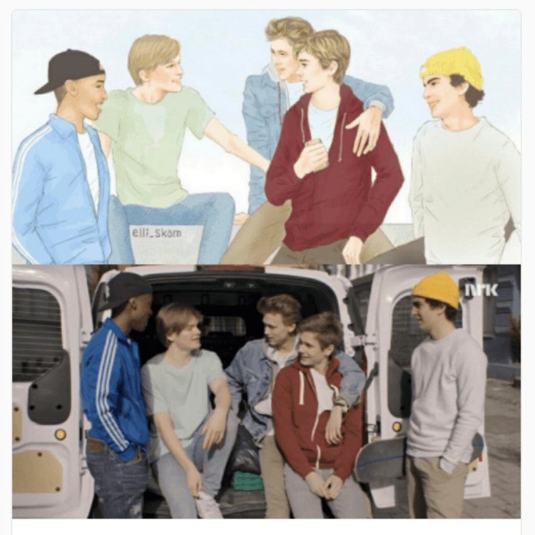 An illustration by Instagram user @elli_skam was used to determine the outfits of the boys crew in their first scene in season four. Credit: Tumblr Everything is Skam