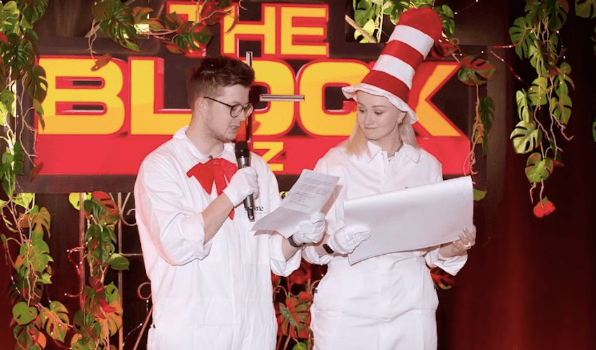 Given the theme “Block Life” and a time limit of 90 seconds, our reno junkies got to work showing off their poetic chops. Chloe and Ben tried to distract from the fact they rhymed “smiling” and “winning” with 35 costume changes and endless innuendo. Stacy and Adam dressed as the Cat in the Hat to do the world’s pussiest roast. Maree and James cosplayed as spiders and Quinn and Ben risked a Will Smith slap for plagiarising the Fresh Prince theme.
