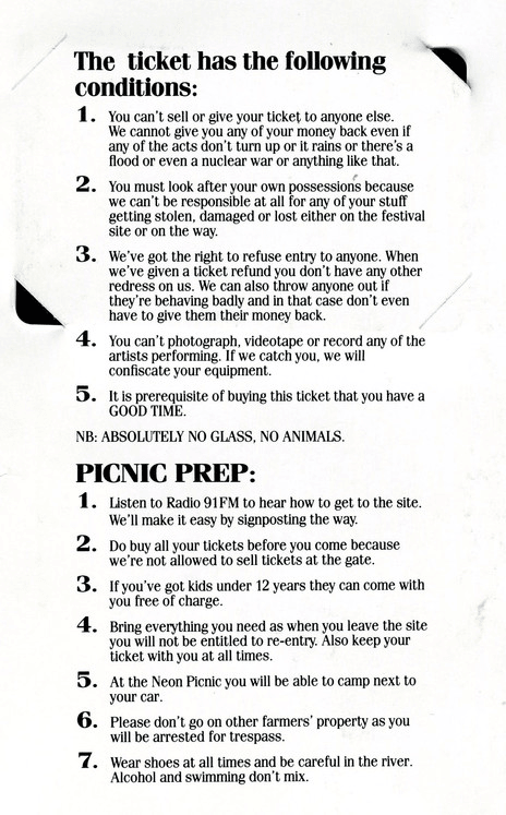 An indication of how desperate the Neon Picnic organisers were is that days before it was to start, the company secretary, Jonathan Blakeman got approval from American Express to put the airfares for the overseas acts on his credit card: $89,000. “Which tends to suggest,” wrote Gordon, “that Blakeman still had an extraordinary belief that the Picnic would come off.” That approval depended on a bank guarantee, which didn’t eventuate.