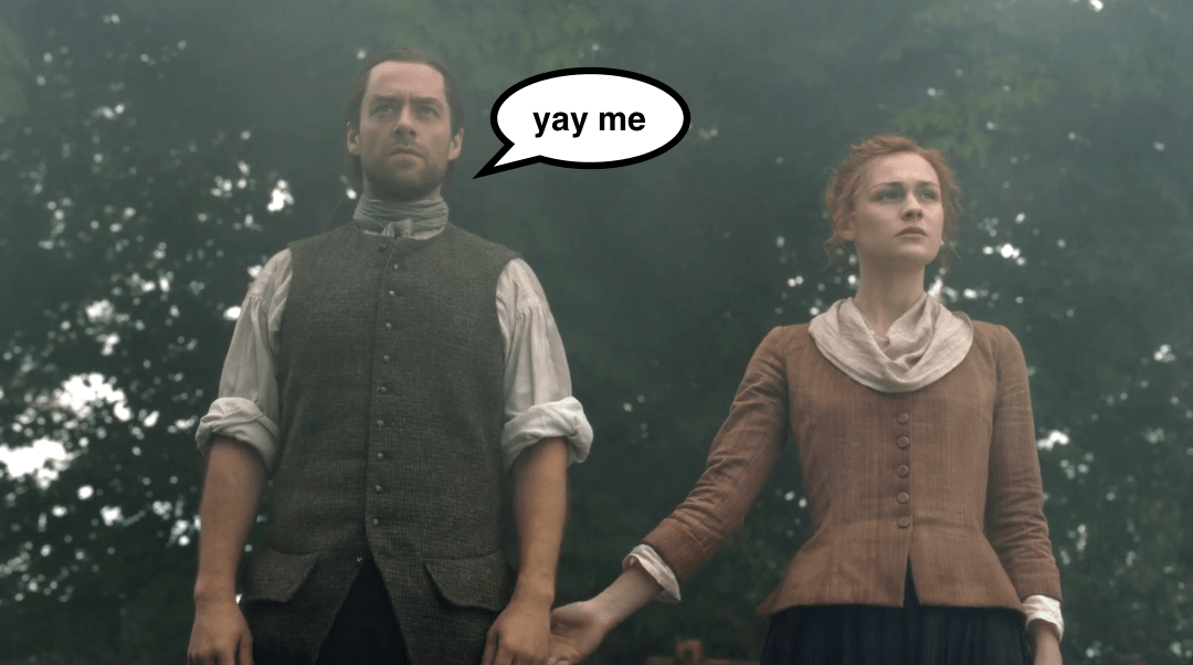 There was plenty of manly jibber jabber about politics this week, but the short version is that war is coming faster than the swarm of locusts that threatened Fraser’s Ridge. It was a crisis of biblical proportions, but Roger stepped up to this Level 4 situation like he was born for it. I mean, give the man some shit and a shovel and he’ll change the path of history. He smoked the locusts out and saved everyone’s crops, and now Roger is basically king of the world.