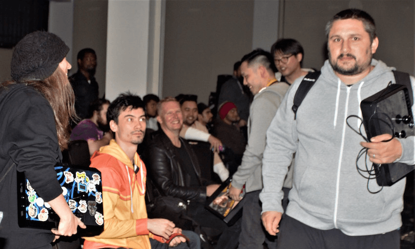 One battler, ‘Westnea’ aka ‘Uncle Calum’ Robertson’s support crew includes six-year-old Jayden Small. Small’s tall companion, his father Dylan, says he’s a bit intimidated: “Everyone’s got pretty flash gear with their fight sticks.” During gameplay, Westnea gets off to a promising start but falls to the superior skills of Rikihana the Terrorist.