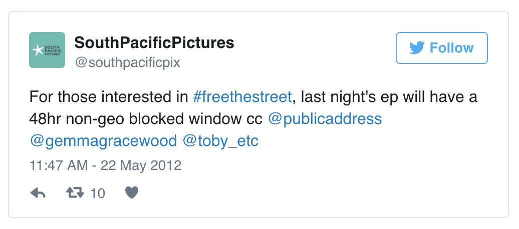 To my excitement, at the 11th hour, a Twitter campaign was begun to #freethestreet. A groundswell of support built and in no time at all you unblocked the episode globally for 48 hours.