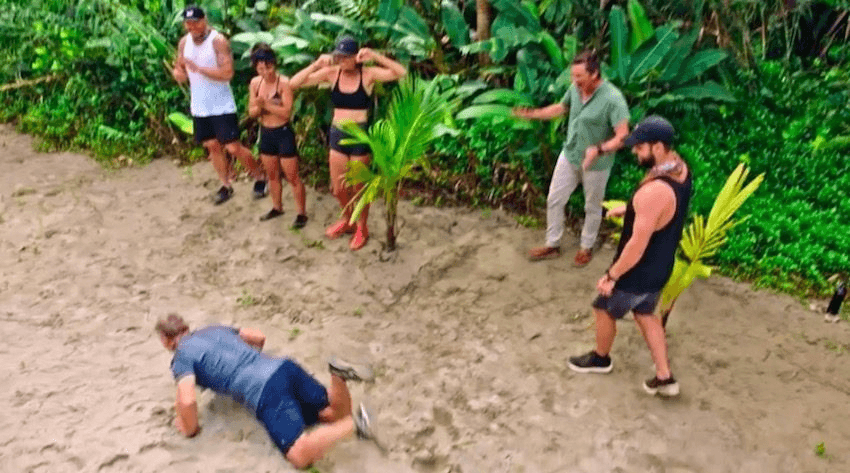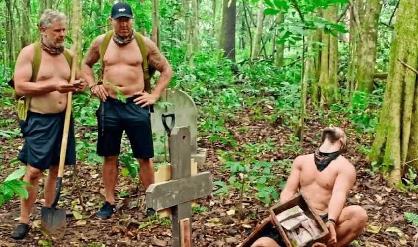 Before we get to that brazen grave-robbing caught on film, I’ll say this about Celebrity Treasure Island: they absolutely turned it out this week. Not a stupid straw-challenge in sight, no Arnott’s biscuits to be nose shuffled, no potatoes to be rolled into a hole. The semi-final challenges were equally hard out, dragging the competitors into the waves to untangle buoys, weaving them through bamboo mazes and making them stand holding coins in a Medieval torture frame that served Jeepers Creepers realness.