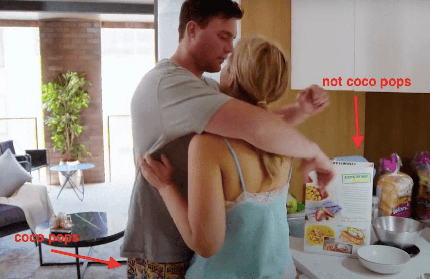 Alas, the plot thickens. Jackson appears to love Coco Pops so much that he will emblazon his own ass cheeks in their image, yet the cereal on the bench appears to be extremely not Coco Pops and more an Anthony-style corn-based cereal. Could Jackson be hiding something? Or are Coco Pops just a “sometimes” food? Either way, these two will undoubtedly work it out.