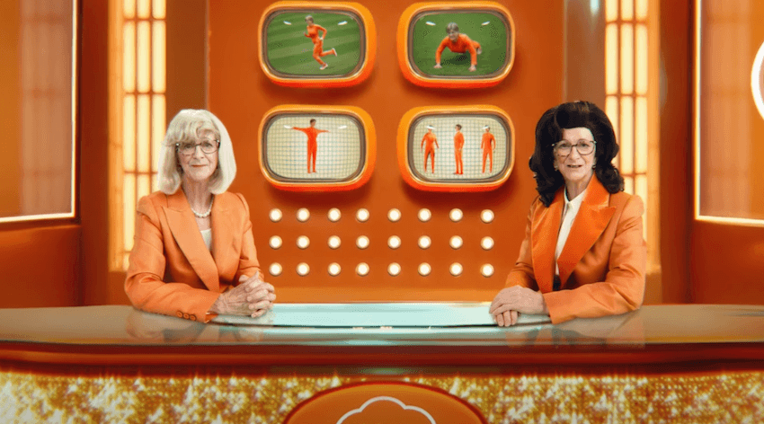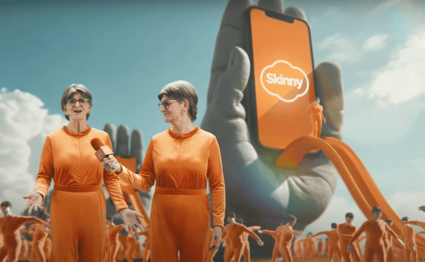 The ad begins with a 1970s-style newsdesk. “Breaking news, Skinny mobile has found a new way to keep prices low,” says Liz. “That’s right,” adds another Liz. “They’ve digitally cloned their happiest customer to make really cost effective ads.” Cut to the outside of the studio, where hundreds upon thousands of Lizzes are dancing while wearing orange velour jumpsuits. Above them looms a row of statues of giant hands, the fingers wrapped tightly around a smartphone.