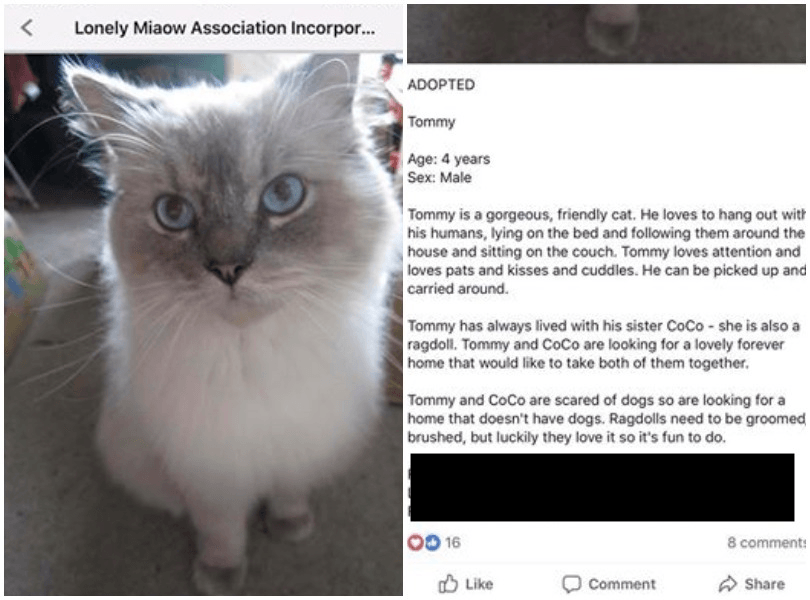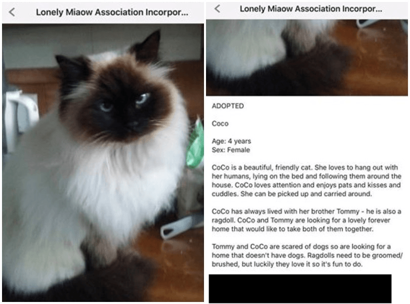 “CoCo has always lived with her brother Tommy – also a ragdoll,” read the entry on the Lonely Miaow. “They are looking for a lovely forever home that would like to take both of them together.”